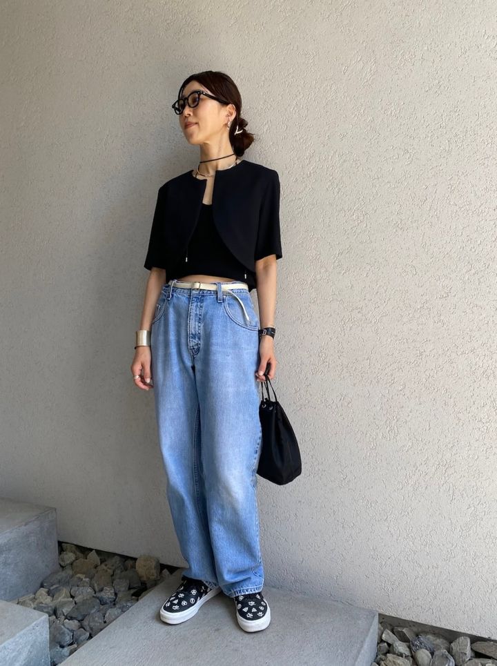 「The.Garmentのボレロ風ショートジャケットに古着のリーバイスシルバータブのメンズデニム、Vansのスニーカーとプラダのポーチを合わせ、甘辛でラフなコーディネートに仕上げました。全身のバランスを締めるようジュエリーは特に手元のボリュームを強調し、ピアスやネックレスは抑えめにしてヌケ感を出しています。素材とカラーはシルバー925を軸に、K18のイエローを少しミックスすることでデニム×シルバーのカジュアルなイメージをクラスアップしています」