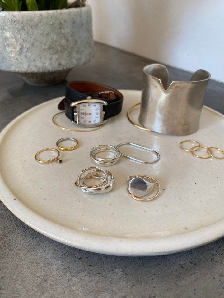 シルバーのダブルフィンガーリング¥23,100、シルバーの3連リング¥34,100、シグネットとK10の細いリングが重なった2連リング¥101,200、ボリュームシルバーとK10の3連リング¥105,600(全てMAYU)、K10の細いバングル、シルバーのボリュームバングル、K18のリング3つ、mayuokamatsuのサファイヤリング、その他は全て本人私物