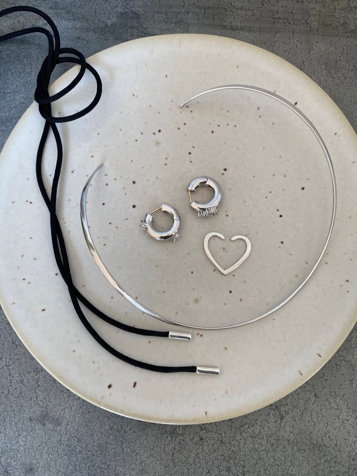黒いコードネックレス¥12,100、シルバーのカフネックレス¥57,200、ボリュームフープピアス<右>¥38,500、ボリュームフープピアス<左>¥38,500、オープンハートイヤーカフ¥19,800(全てMAYU)