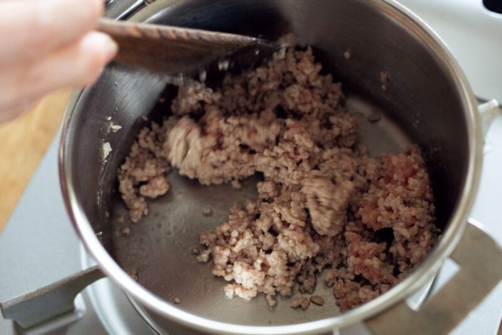 鶏ひき肉は脂分が少なく、鍋底にこびりつきやすいので焼き付けず、水と一緒に鍋に入れて火にかけ、じっくりと煮出すのがポイント。