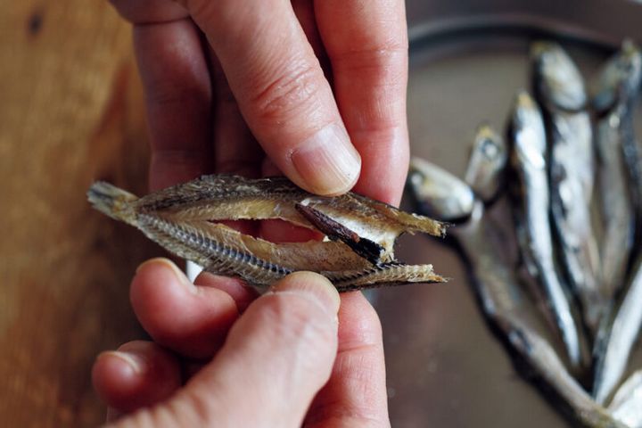 煮干し約10尾の頭を除き、背の部分から開いてはらわたを取る。