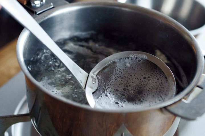 魚、肉は沸く前にふたをすると臭みがでるのでふたはしないこと。骨など煮干しの口当たりが苦手な人は、煮立った後にとりだして。