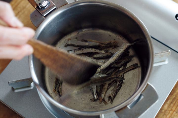 煮干しの脂は時間とともに酸化するため、乾煎りするのがおいしく仕上げるコツ。