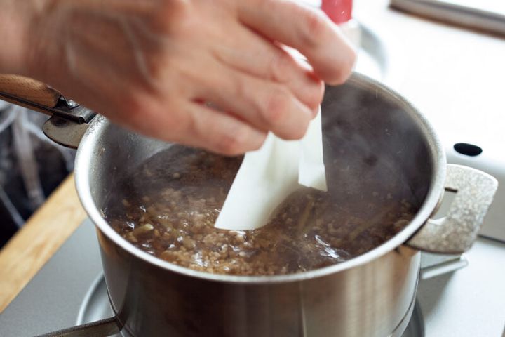 「だしとしても具材としても使えるのがひき肉。新鮮な肉を選び、焼き付ける際に日本酒をふりかけると臭みが消え、ていねいにあくを取りながら煮出せば、和洋中、何にでも合うおいしいだしがとれます」