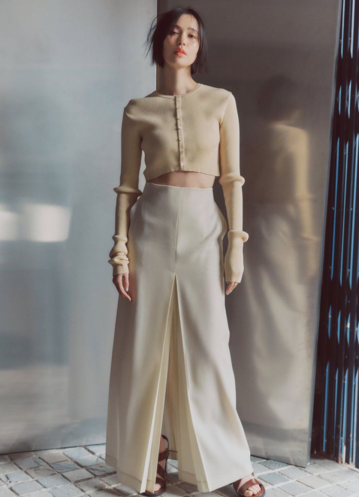 トップス¥35,200、スカート¥48,400(共にオーラリー)、サンダル¥10,990(ザラ/ザラ カスタマーサービス)、ピアス¥167,200(ヒロタカ/ヒロタカ 表参道ヒルズ)