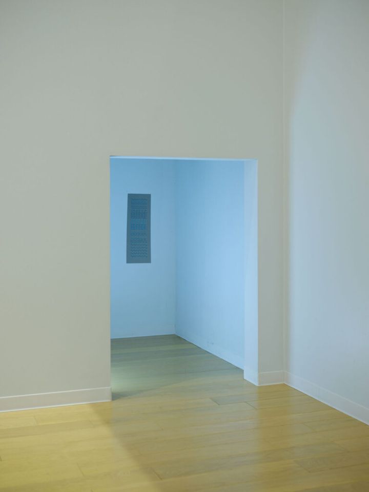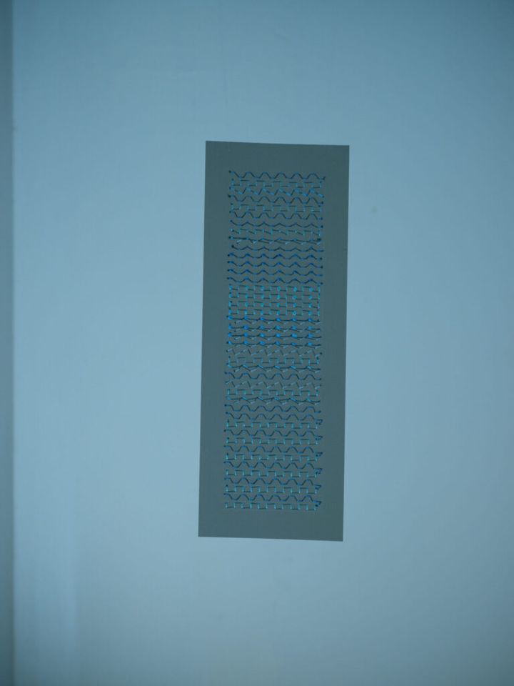 ある日の水泳メニューを記号化した刺繍作品/個展「migraine aura」 (2022)より。photo:Takashi Homma