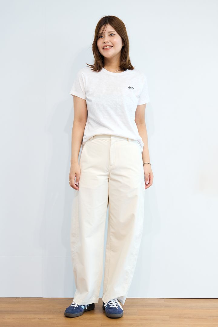 夏のベーシックスタイル「白T×デニム」も、凹凸のある生地や胸元の目モチーフのおかげで洒落感が高まります。上下を白で統一してものっぺりしません。ただ、「WHITE」は若干透けるため、インナー選びには気をつけたほうがよさそうです。