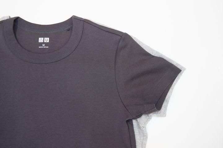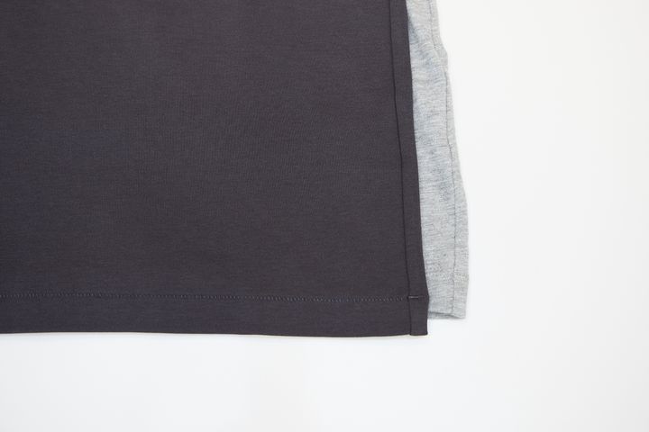 下に置いたグレーがスラブT、黒がユニクロユーのクルーネックT。どちらもMサイズでコンパクトなシルエットですが、スラブTのほうが全体に若干ゆとりがあります。着丈は、クルーネックTのほうが若干長めです。
