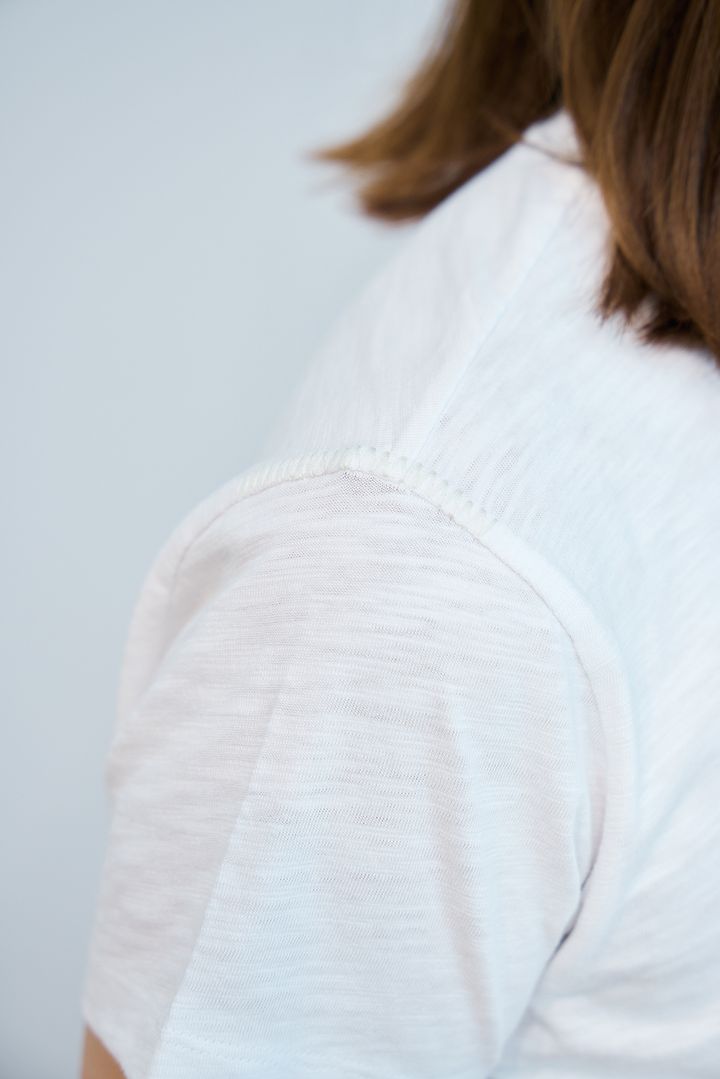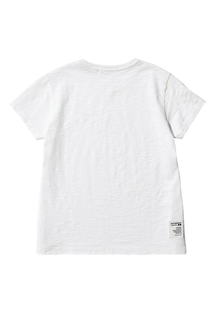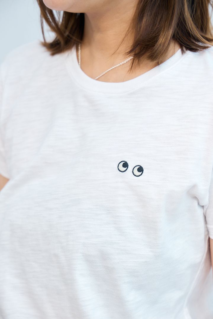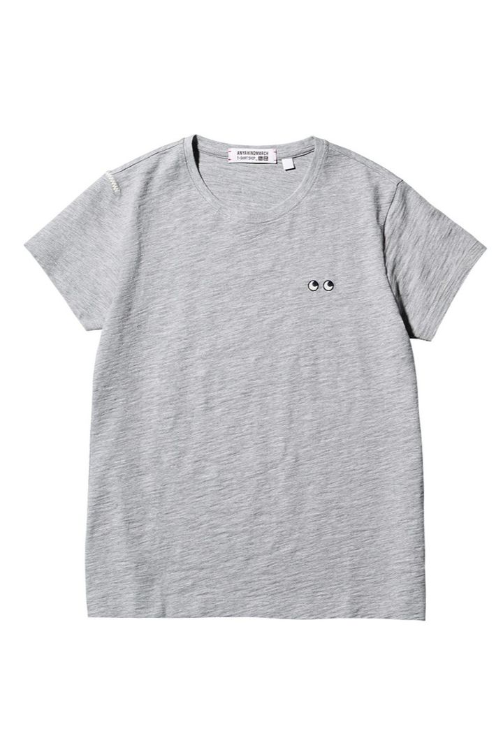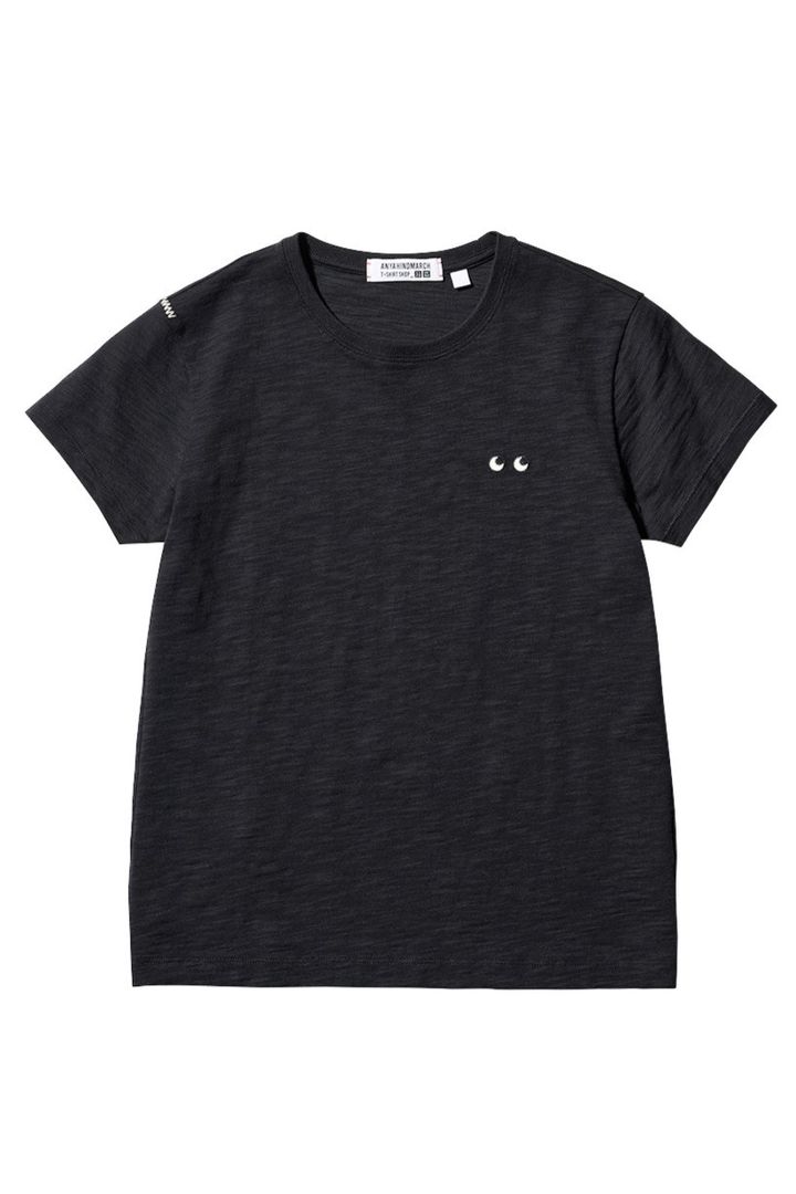 生地に凹凸のあるスラブ素材を使用した、ナチュラルな風合いが特徴的な一枚。袖幅、身幅がやや狭いコンパクトなシルエットでも、ふわっと柔らかな肌当たりで着心地抜群です。襟ぐりが詰まりすぎていないぶん、顔周りがすっきり見えるのもうれしいところ。胸元にはアニヤらしい目モチーフ、右肩にはハンドステッチ風のジグザグステッチが。右後ろ裾に施されたデザインタグの下部にはユーモア溢れるワードが添えられています。