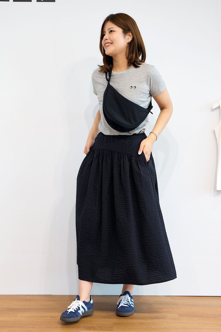 T2CLASSIC/スラブT※Mサイズを着用¥1,990(ユニクロ×アニヤ・ハインドマーチ/ユニクロ)スカート¥3,990 バッグ¥1,500(ともにユニクロ)その他本人私物