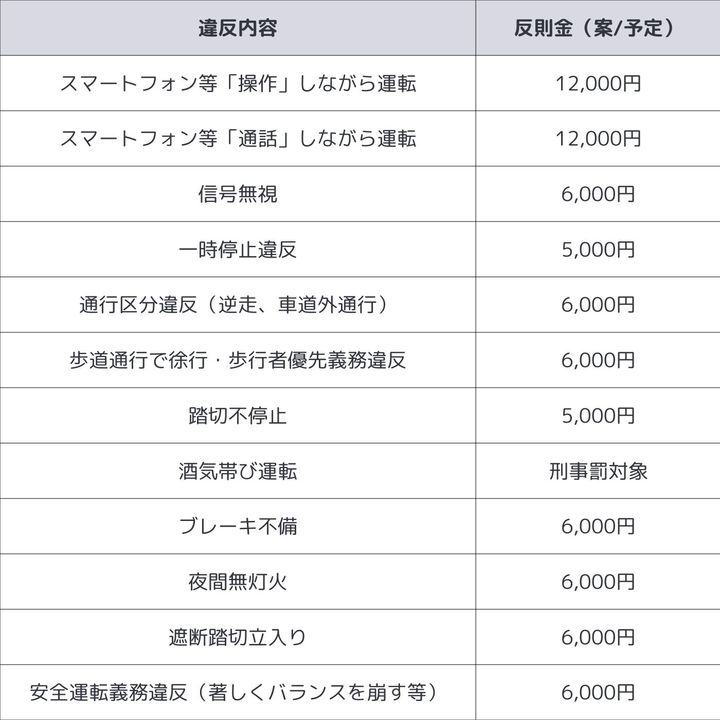 例えば「スマホを使用しながらの走行」は1万2,000円、「信号無視」や「逆走・歩道通行」などの通行区分違反には6,000円、「指定の場所で一時停止しなかった場合」は5,000円の反則金が課されます。違反内容と反則金に関しては以下の通り。ぜひこの機会にルールを確認しておきたいものです。