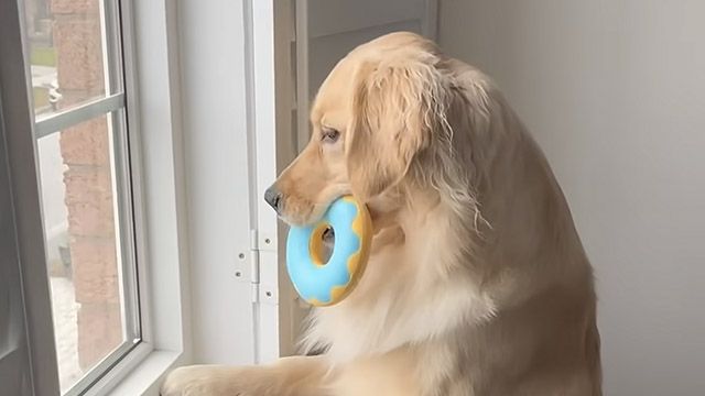 窓辺にじっと座っているゴールデンレトリバーさんの姿。