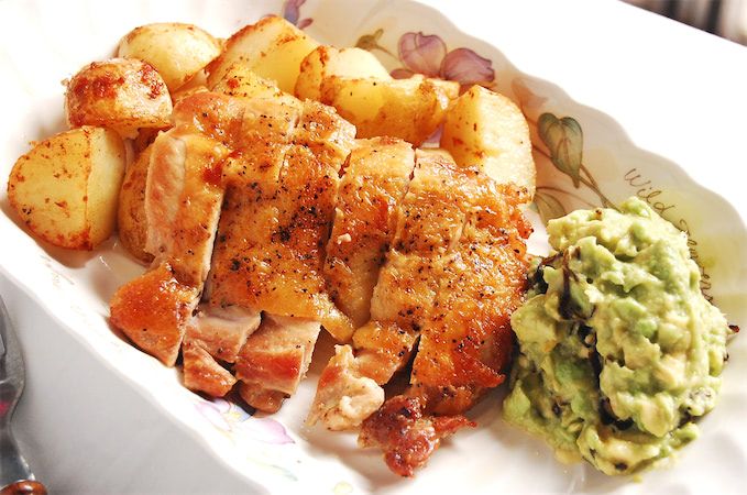 7. 鶏肉に火が通ったら、食べやすい大きさに切ってお皿に盛り付けます。じゃがいもとアボカドソースを添えれば、出来上がり。