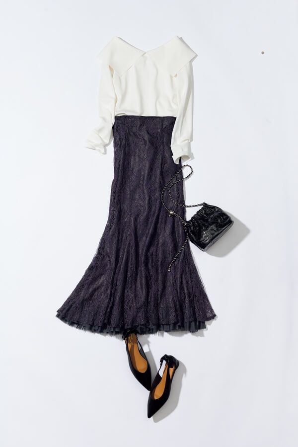 裾からチュールがのぞくレーススカートは、腰後ろがレースアップになっているのでバックスタイルまで美しく♡ Vネックのえり付きニットで上半身の抜け感も抜かりなく。