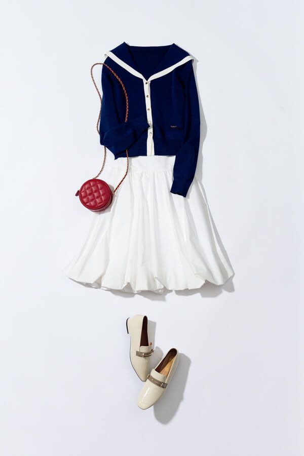 ひざがちょうど隠れるくらいのミニ丈バルーンスカート。春マリンムードを高めてくれるセーラーえりニットは、メリハリを出せるバイカラーデザインをセレクト。
