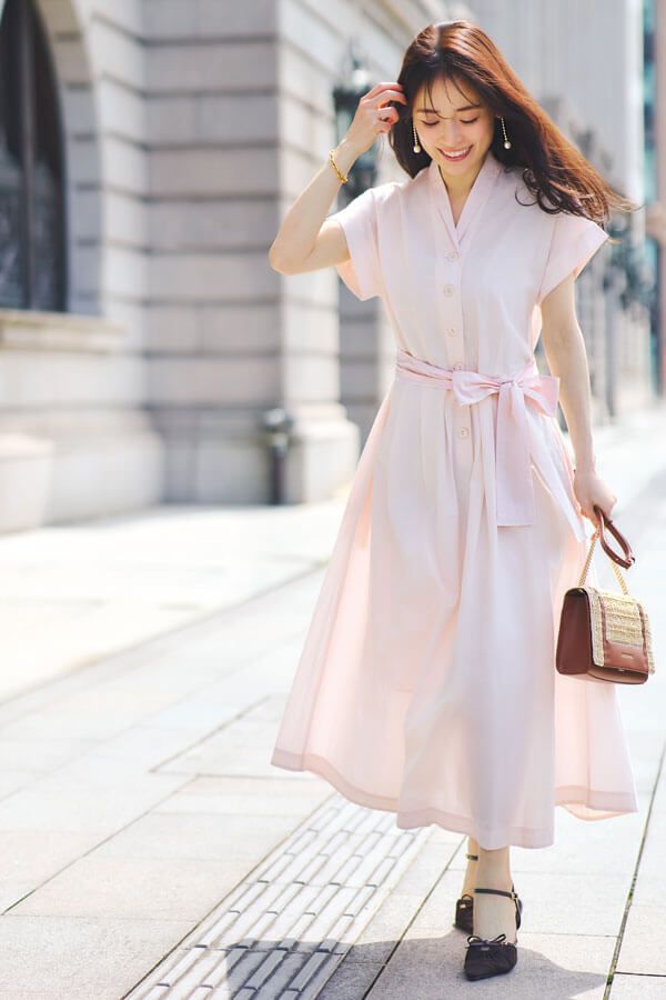 透明感ある薄ピンクで可憐な華やぎを放って♡涼しげ素材の爽やかなシャツワンピ