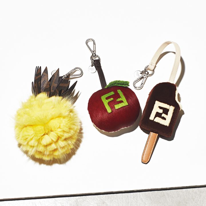 お茶目なモチーフをフォックスファーなどラグジュアリーな素材で表現。左から「パイナップル」チャーム〈PINEAPPLE CHARM〉¥162,800「アップル」チャーム〈CHARM MELA〉¥100,100「アイスキャンディ」チャーム〈CHARM CREMINO〉¥124,300※すべてメンズ商品(すべてフェンディ/フェンディ ジャパン)