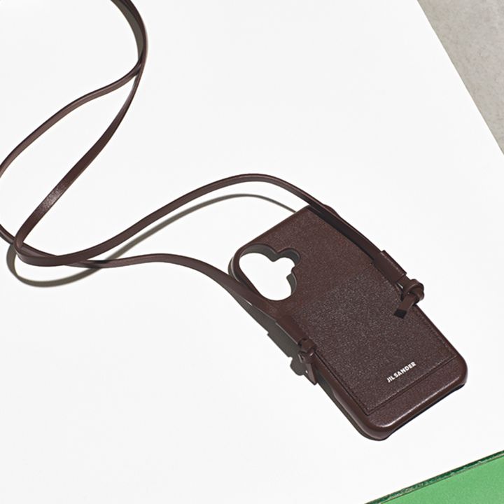 ジェンダーレスなアイテムで女性が持っても◎。シンプルかつ洗練されたデザインでアクセサリー感覚で持てるのに10万円を切る価格もうれしい。スマホケース〈PHONE CASE 16 WITH LACE〉¥96,800(ジル サンダー/ジル サンダージャパン)