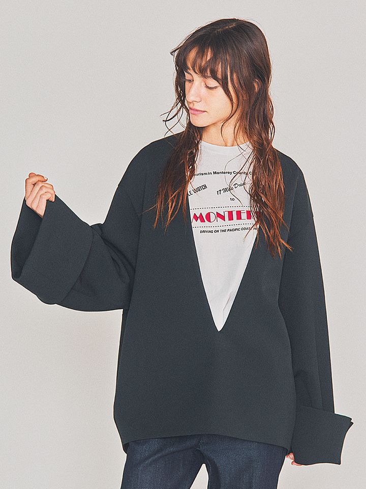 黒Vネックスウェット/ル フィル(LE PHIL NEWoMan 新宿店) 中に着たTシャツ/TICCA 伸縮性のあるボンディング生地に、ざっくりとした深いVでキレ味よく。中にロゴTを重ねると、キャッチーなアクセントに好転。