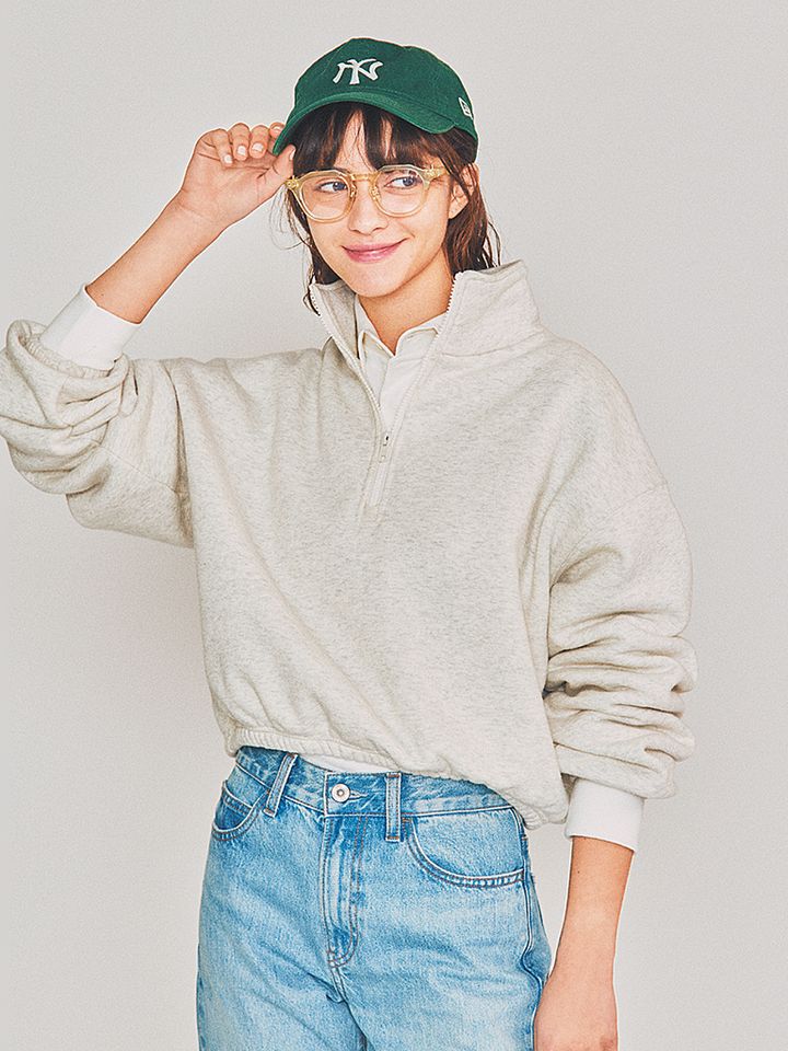 ハーフジップスウェット/SeaRoomlynn キャップ/ニューエラ 眼鏡/パイン(フォレストパイン・デザインラボ) 中にシャツを仕込んでボリュームアップ。首まわりの存在感を、ショート丈でバランス調節。