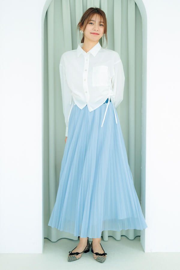 シャツ¥8,910/リリアン カラット プリーツスカート¥26,400/イチエ(シュガー・マトリックス) ピアス¥3,300/RESEXXY 靴¥8,250/RANDA