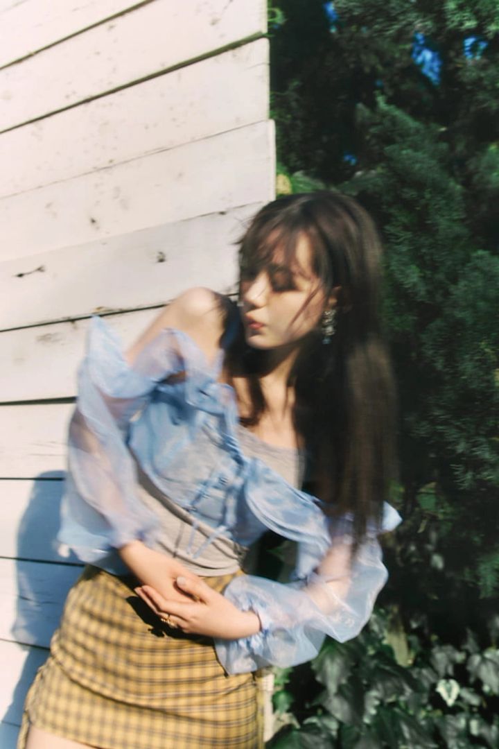 ブルーシアートップス 13,800円/lilLilly(lilLilly TOKYO)キャミソール 1,749円/スピンズ チェックスカート 11,110円/CRANK(HANA KOREA)イヤリング 5,280円、リング 3,080円/ともにLiquem