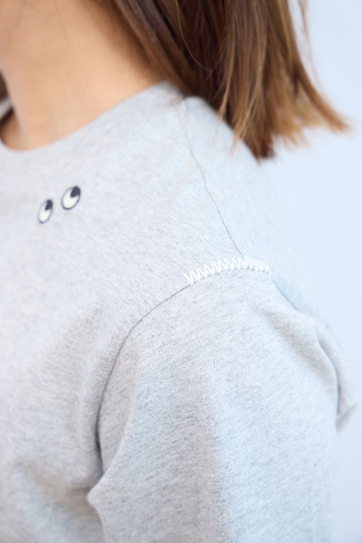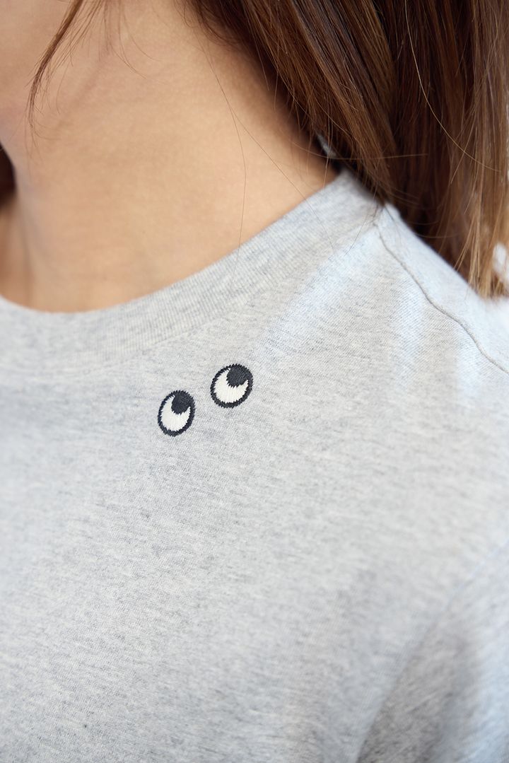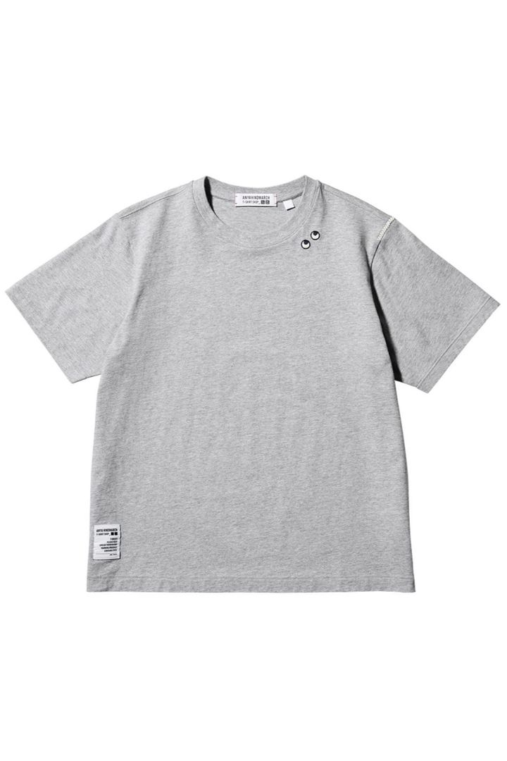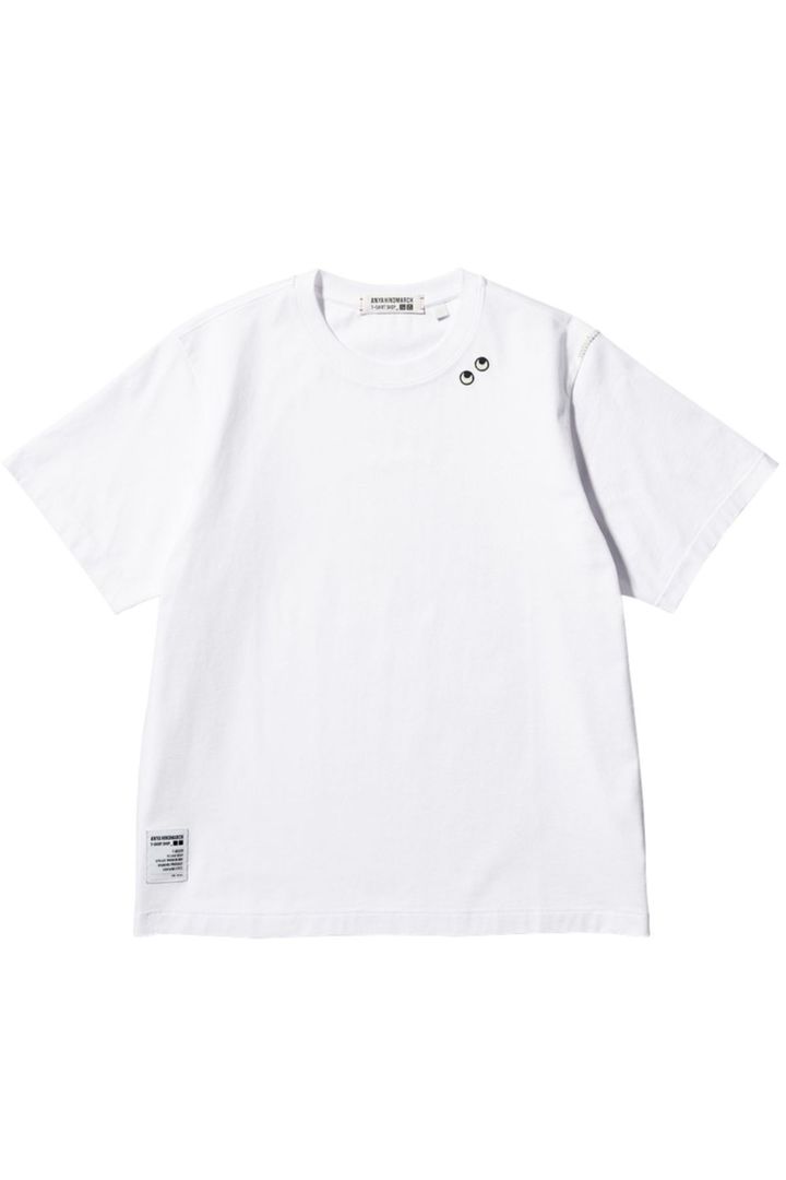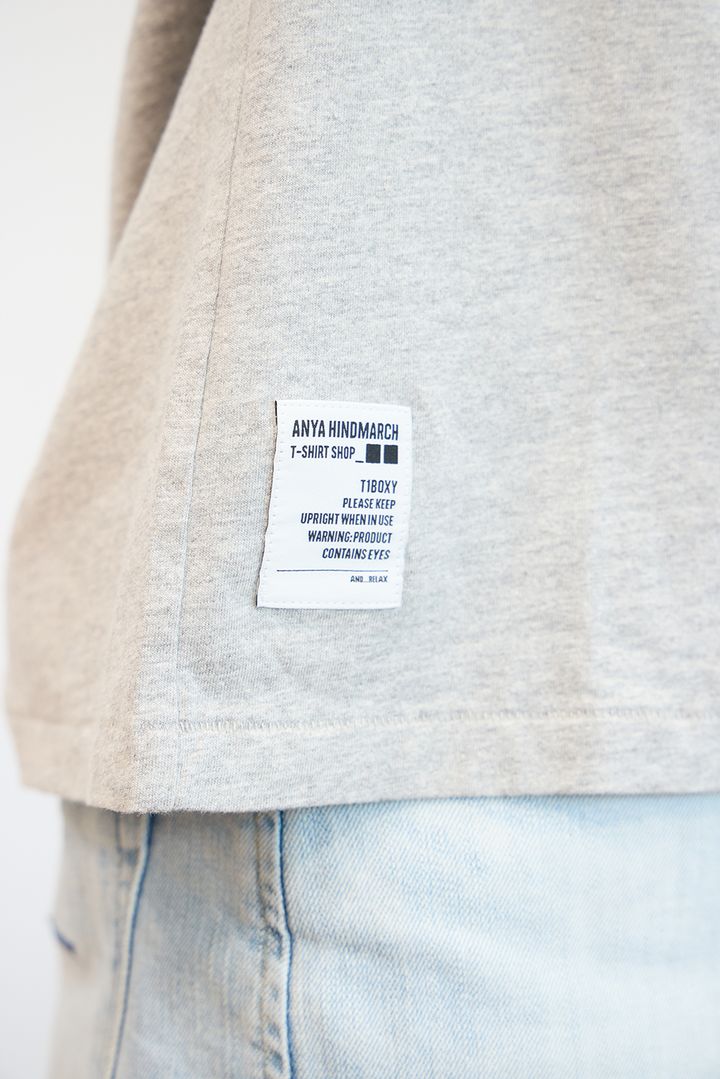 肌離れがいいボックスシルエットで涼しく着られるうえに、体を一回り小さく見せてくれる効果もありそう。ほどよくハリがあり、裾をインしてもアウトしても美シルエットをキープしてくれます。首の左側に目モチーフ、左肩はハンドステッチ風のジグザグステッチ入り。裾の右前に位置するデザインラベルのユーモア溢れるワードは、デザイナーのアニヤ・ハインドマーチ氏のこだわりで、アイテムごとに異なるのだとか。