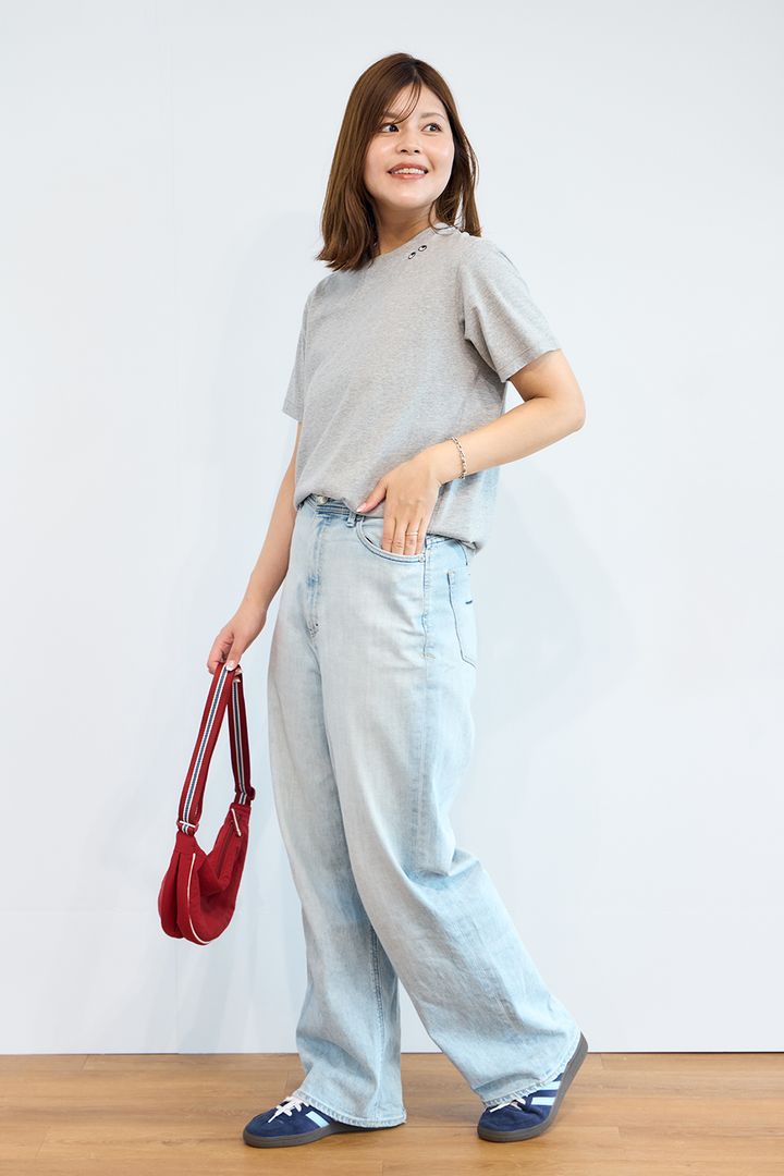 デニムと合わせたシンプルコーデも、ボックスシルエットのTシャツのおかげで一気に今っぽく。明るめのグレーTに薄色デニムと全体を淡色でまとめれば、ゆるT×ゆるデニムのリラクシーカジュアルに女性らしさが宿ります。