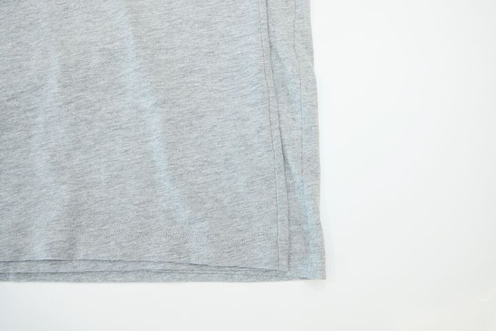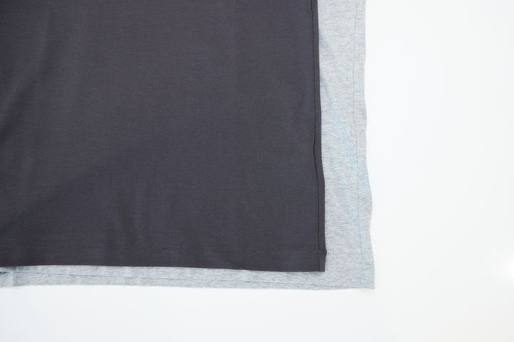 グレーがボクシーT、黒がクルーネックTでこちらもMサイズを比較。スラブTよりもさらにコンパクトなクルーネックTと比べると、ボクシーTのビッグシルエットがより際立ちます。