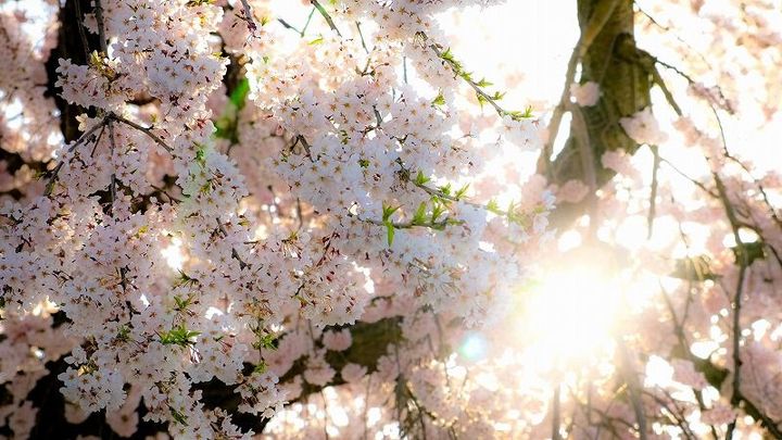 春の日差しの中、満開のしだれ桜が風に揺れます。木漏れ日が差し込み、桜の美しさと春の暖かさを感じさせてくれます。