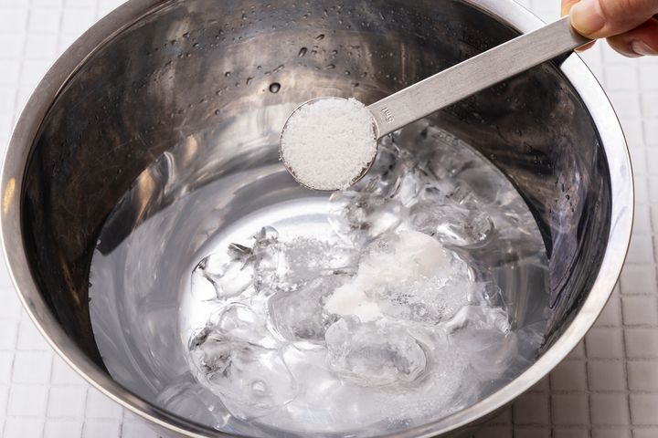 (1)熱伝導の早いステンレスボールに、水200~300mlとたっぷりの氷、塩大さじ2を入れる。