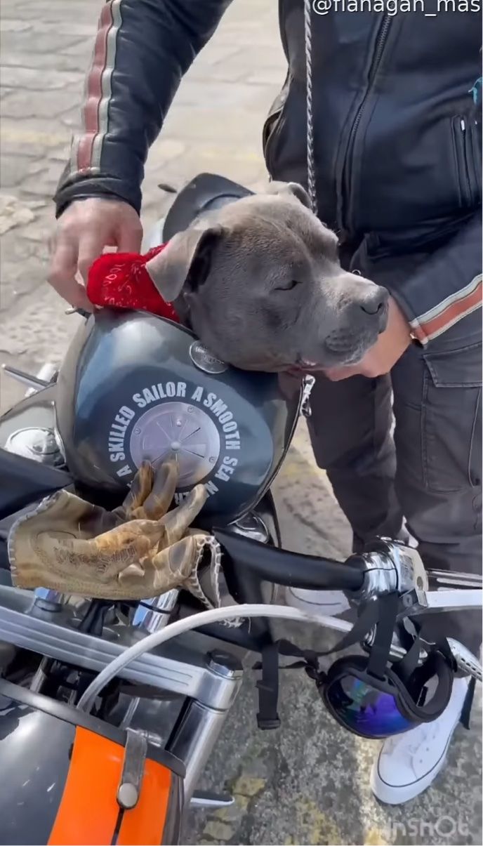 飼い主さんが合図を出すと、さっそくバイクに飛び乗りました。 この子には、お気に入りの特等席があるんです!