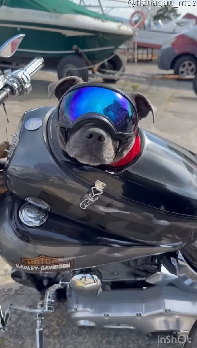 飼い主さんとバイクでタンデムするのが大好きなイヌ。 特等席にいそいそと乗り込むと・・・、カッコいいゴーグルを装着してもらいました!