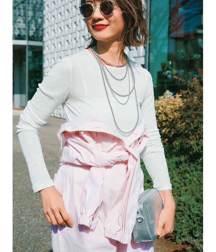 メンズっぽくてハードルが高い「つなぎ」は淡いピンクを選択するのが正解。さらにシースルートップスとネックレス盛りで媚びない甘さを。新しい自分が発見できて、多幸感あるコーデに。(本誌ライター端迫絵実)