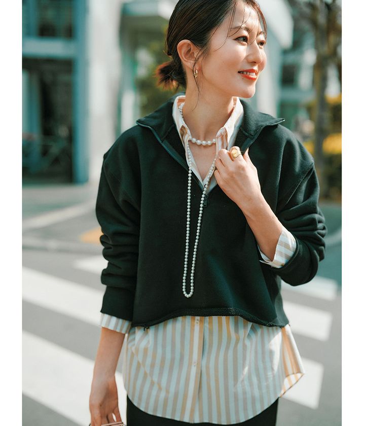 黒のワントーンは、ともすると〝完璧主義〟に見えて近寄りがたい印象になりがち。リラックス感のあるハーフジップと女っぽい透けスカートで隙を作れば「オシャレな人」に昇華できそう。(本誌ライター山本亜矢)