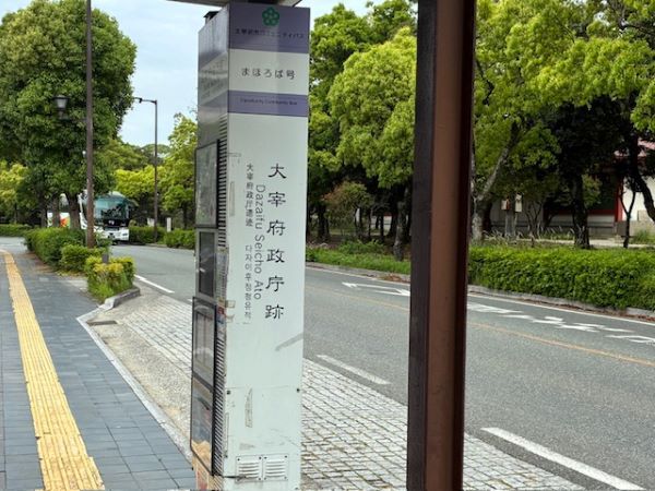 「西鉄太宰府駅」から「大宰府政庁跡」までおよそ18分(車で約6分の距離ですが、バスは経由地があるので少し時間がかかります)。