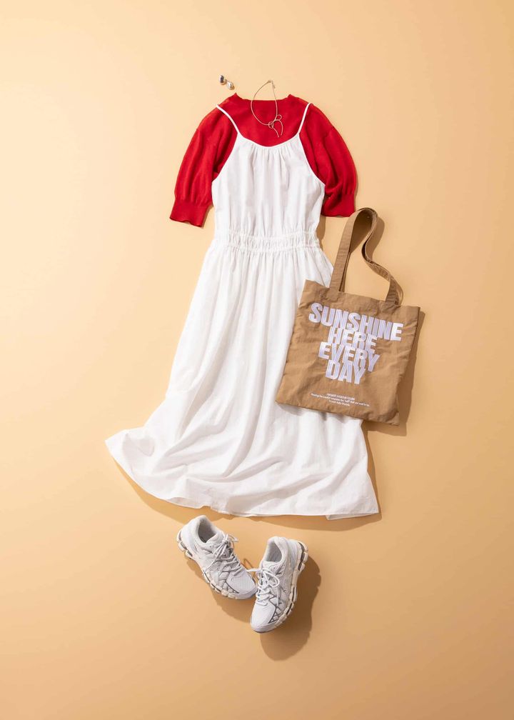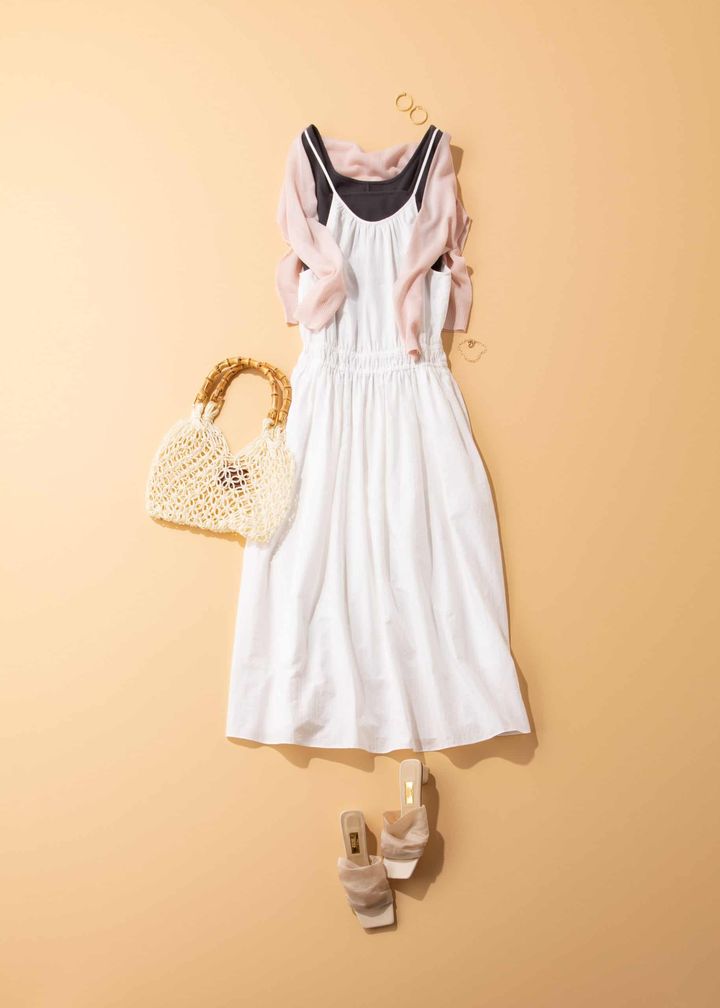 ワンピースは着回し。カーディガン¥3,498(グローブ)タンクトップ¥3,990(アンフィーロ/アンフィーロ<オンワード樫山>)バッグ¥17,600(ケッシュ ル エッセンシャル)シューズ¥14,300(ル タロン グリーズ/ル タロン)ピアス¥11,000(ワンエーアールバイウノアエレ/ウノアエレ ジャパン)ブレスレット¥101,200(ココシュニック)