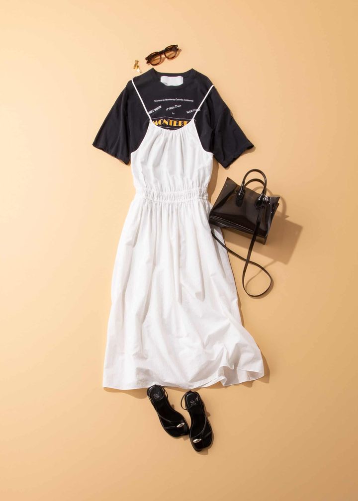 ワンピースは着回し。Tシャツ¥13,200(ティッカ)バッグ¥14,300(ジェービーアタイア/ドレステリア)シューズ¥14,300(シー ユナイテッドアローズ)サングラス¥1,990(ユニクロ)イヤリング¥6,600(ココシュニック オンキッチュ/ココシュニック)