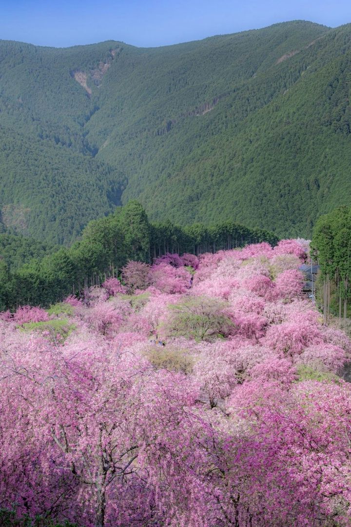 山の緑とのコントラストが美しい、濃淡さまざまなピンク色の桜が織りなす光景は、まるでピンク色の雲海のよう。言葉を失うほどの美しさです。桜はほんのわずかな期間しかその姿を見せてくれませんが、だからこそ、その一瞬を惜しみなく咲き誇っているようにも見えます。自然が織りなす奇跡の風景と言えるでしょう。