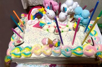 今年の娘のバースデーはユニコーンとレインボーがテーマ。めっちゃ派手なケーキを作ってもらいました!