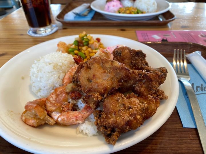 ガーリックシュリンプともち粉の衣を使ったハワイアンフライドチキンを注文しました。