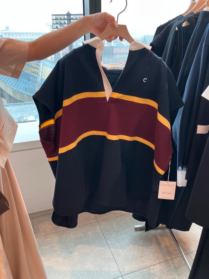 襟つきのプレッピーかつスポーティなラガーシャツ風トップスは40代にオススメのアイテム。体が泳ぐシルエットでありながら女らしさもあり、着ると注目を浴びる可愛いさに。