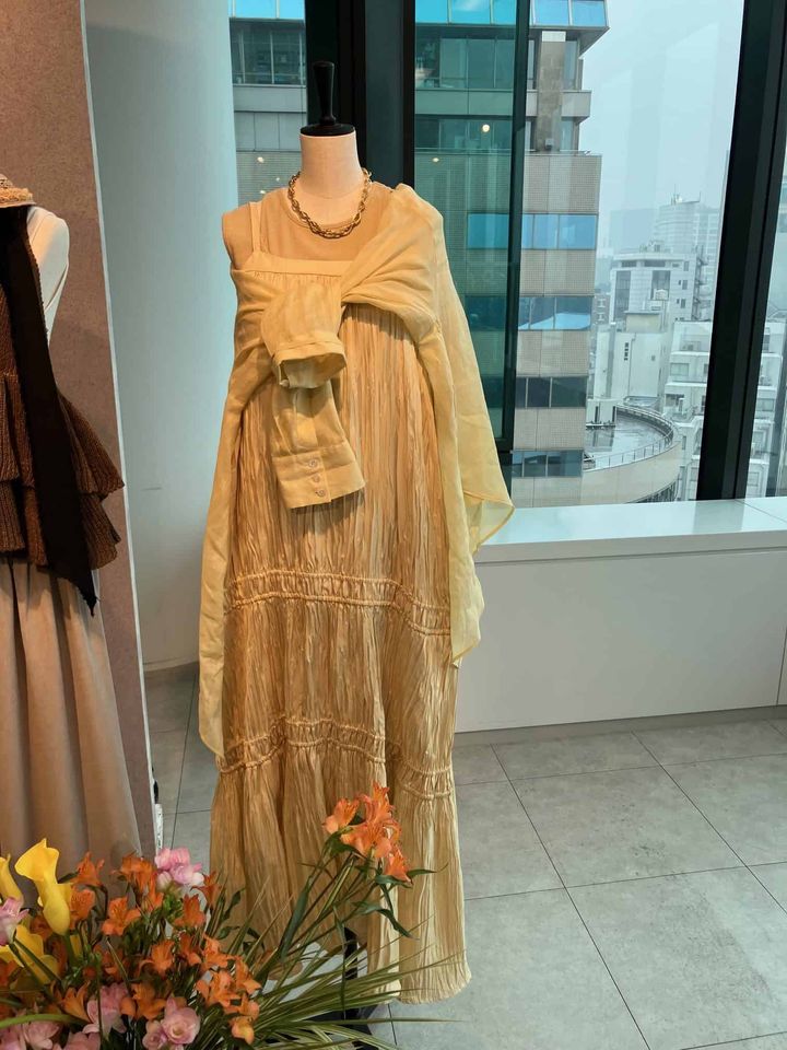 ワントーンでまとめたタンクトップとキャミソールワンピース。肌なじみよいイエローベースのワンピースは今期のトレンドカラー。羽織を肩がけすると二の腕も気にならずおしゃれ度がアップします!