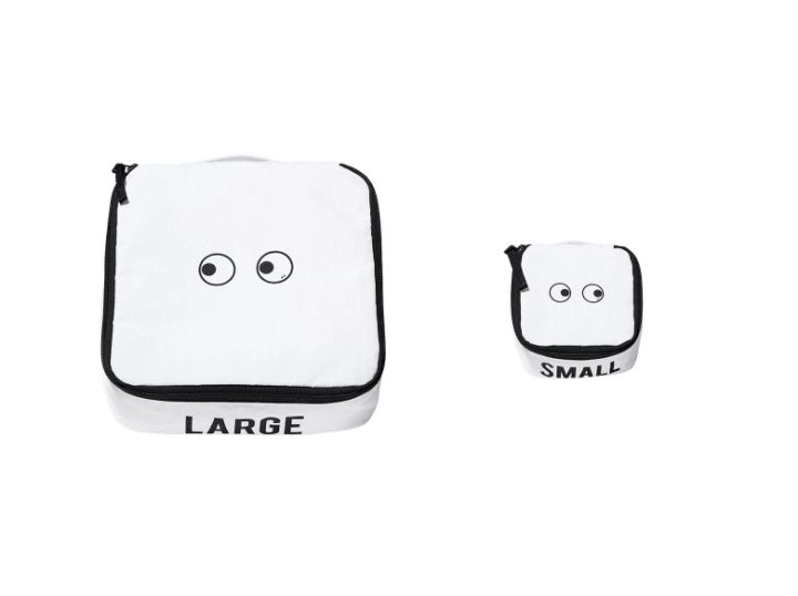 ナイロン素材のスクエアポーチは大小2サイズ。旅行時の洋服を仕分けたり、オムツを入れて持ち運んだりできるラージサイズと、コスメや子どものヘアアクセなど小さなものをまとめるのにちょうどいいミニサイズがあります。大きな口にも見えるファスナーはフルオープンでき、フックに掛けられる持ち手もついているので使いやすいですよ!
