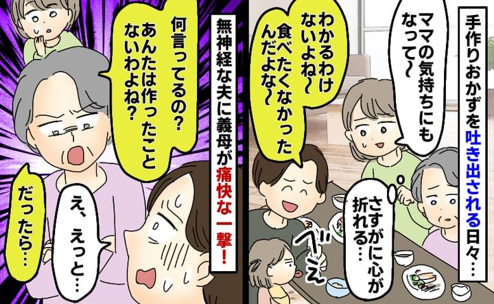 3. 1歳の娘に手作りおかずを作るも「また吐き出された…」落ち込む私に夫が無神経な発言。義母が痛快な一撃
