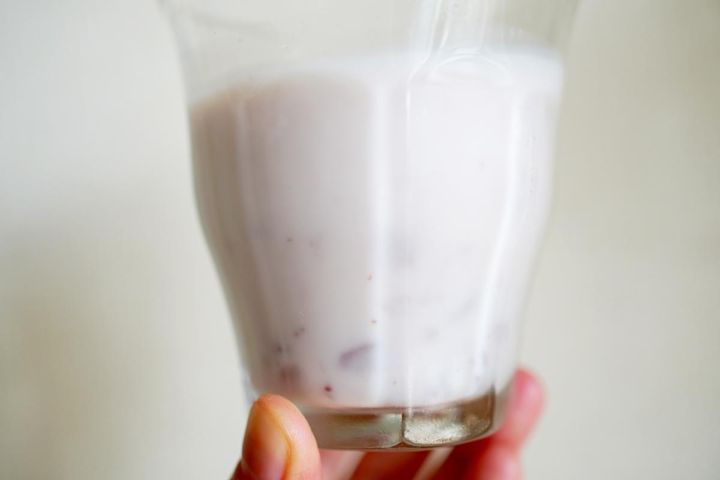 グラスに移し替えてみると、着色料が使われていない自然ないちごミルクの色合い。底には、砕かれた果肉が入っているのがわかります。