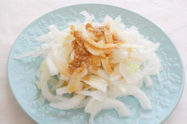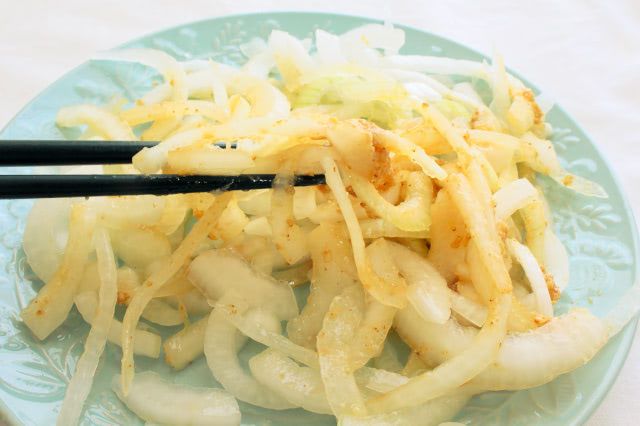 手作りごまドレッシングをかけた「繊維を断ったオニオンスライス」がこちらです。新玉ねぎを使ったので、純白のオニオンスライスになりました。