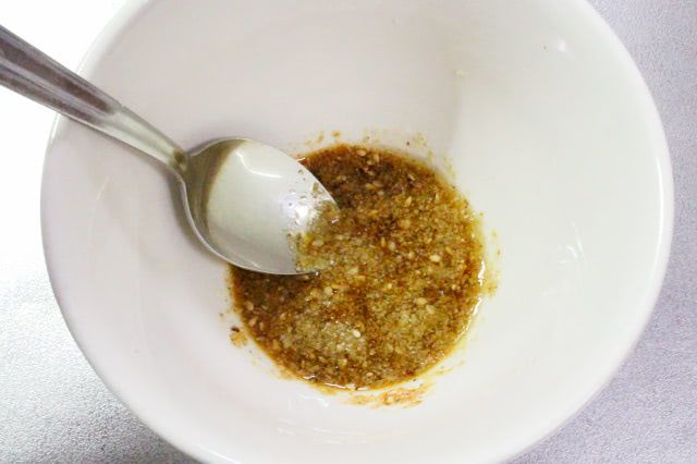 4. しょうゆ、酢、ゴマ油、白ゴマを混ぜてごまドレッシングを作ります。