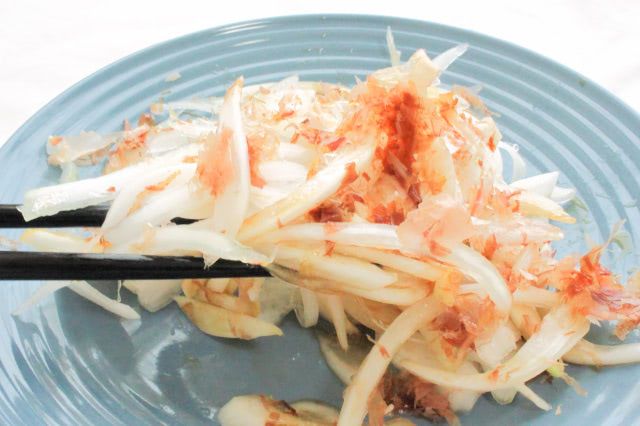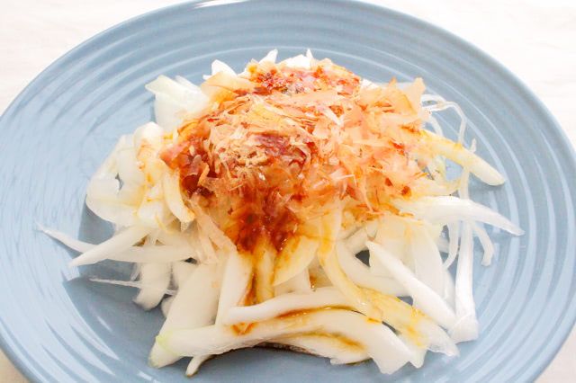 「繊維に沿ったオニオンスライス」は、かつお節を乗せてしょうゆをかけて仕上げました。