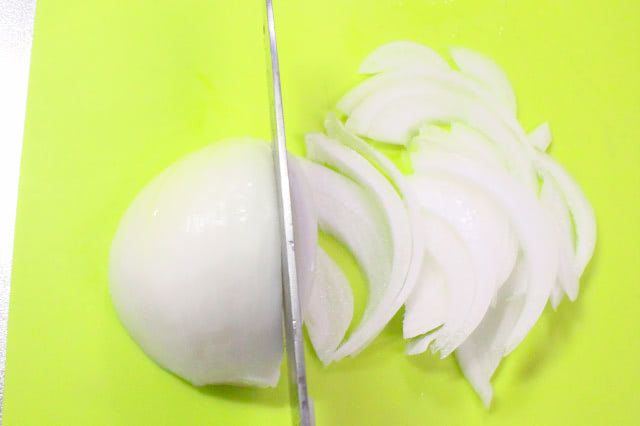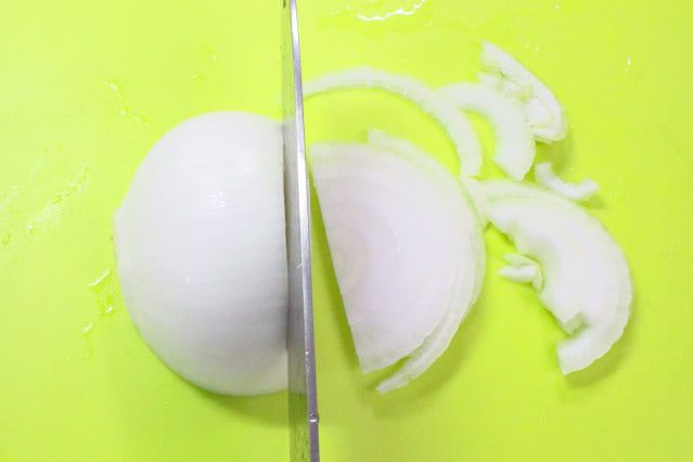 縦半分に切った玉ねぎをそのままの向きで切れば、繊維沿った切り方になりますよ。筆者はいつも繊維に沿う切り方なので、普段の薄切りという感覚です。